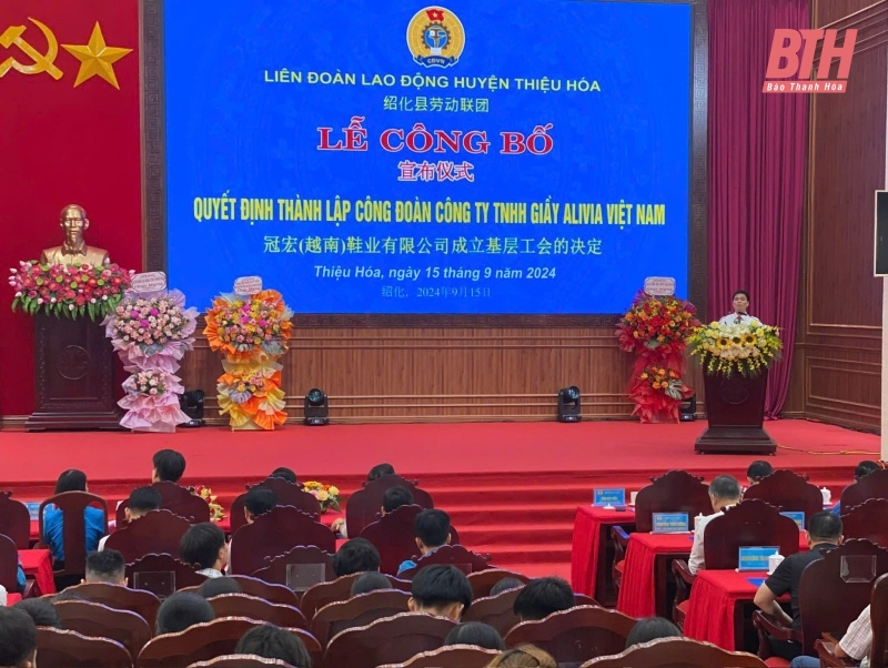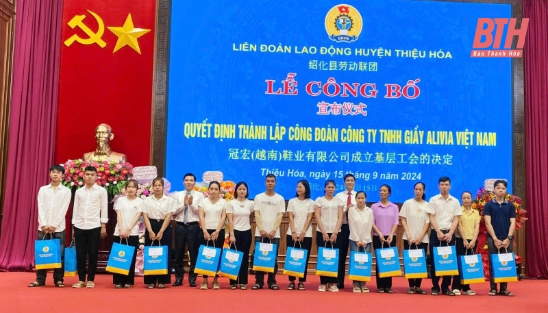 Ngày 15/9, Liên đoàn Lao động (LĐLĐ) huyện Thiệu Hóa đã tổ chức lễ công bố quyết định thành lập Công đoàn Công ty TNHH Giầy Alivia Việt Nam.